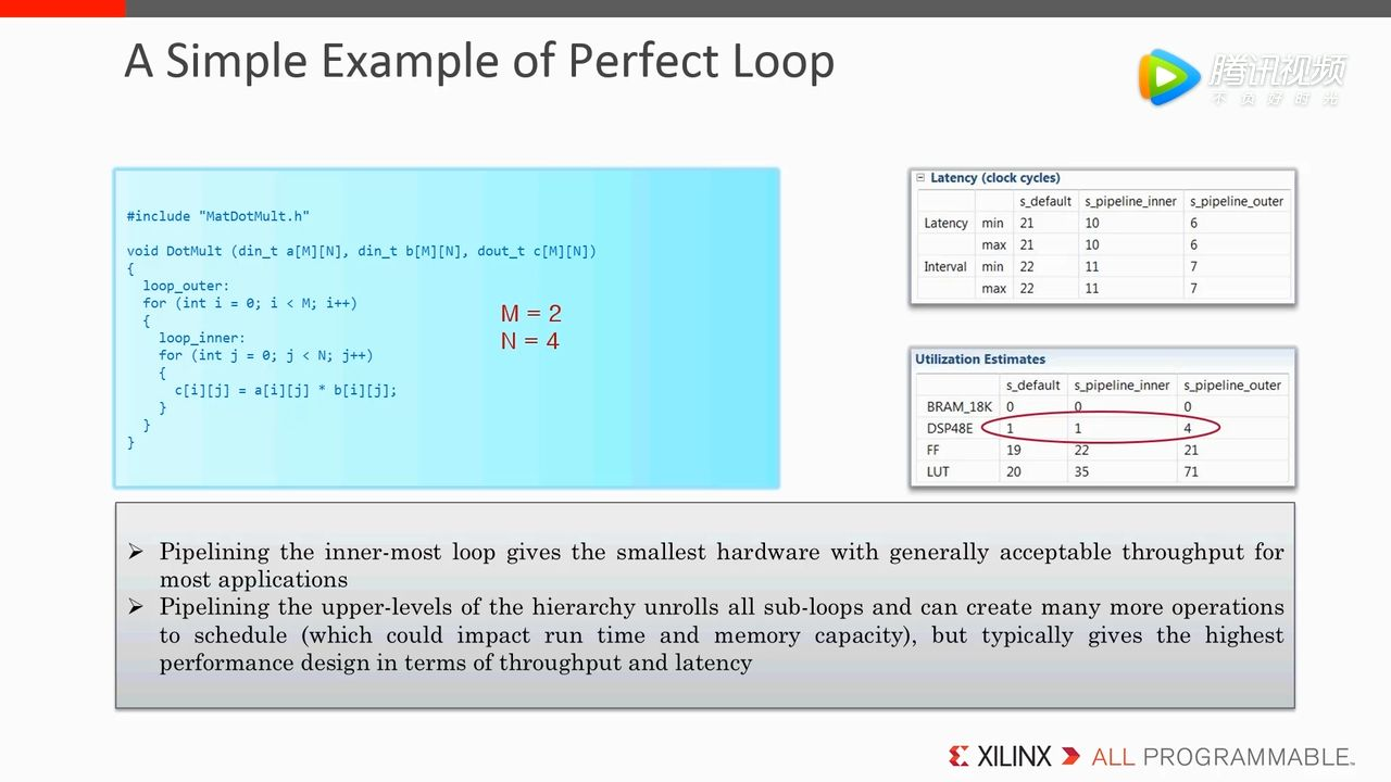 以下面代码为例,是一个 Perfect Loop,这里 M = 2, N = 4。然后对比了三种 solution,分别是不做任何设置,只对内部 loop 做 pipeline 和只对外部 loop 做 pipeline。从 latency 上看对外部做 pipeline 是最小的,但 utilization 确实最大的,这是因为在外部 loop 做 pipeline 的话其下的所有 loop 都会被打开,可以看到这里 DPS48E 使用了 4 个。