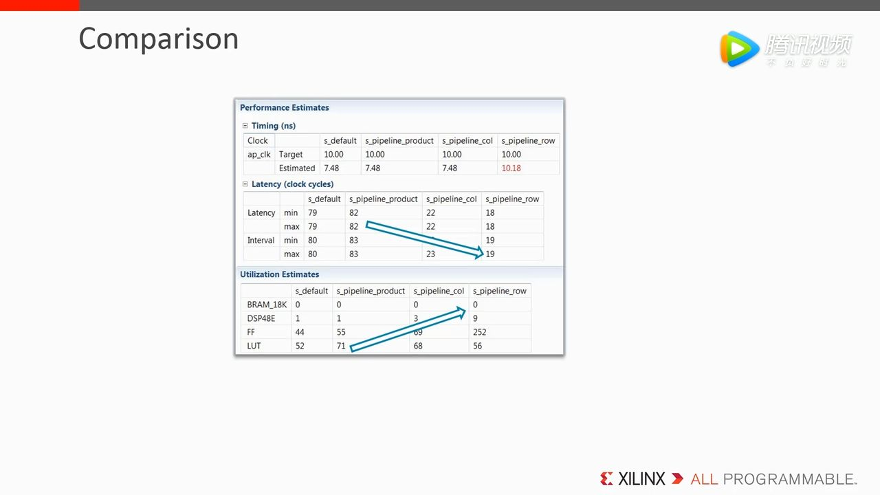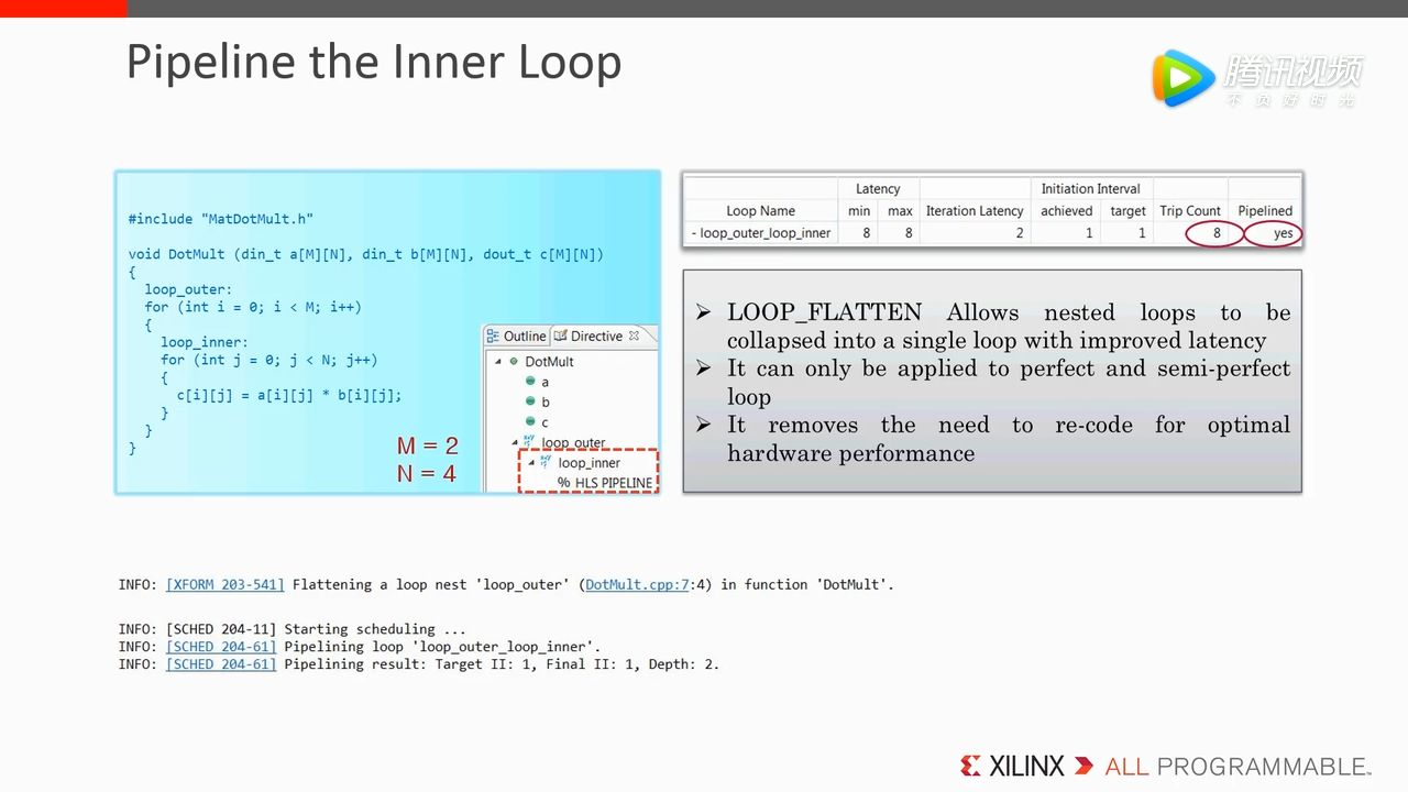使用 LOOP_FLATTEN 实现上面的结果,来将两个 loop collapsed into 一个,以提升 latency。这种方式只适用于 perfect 和 semi-perfect 。