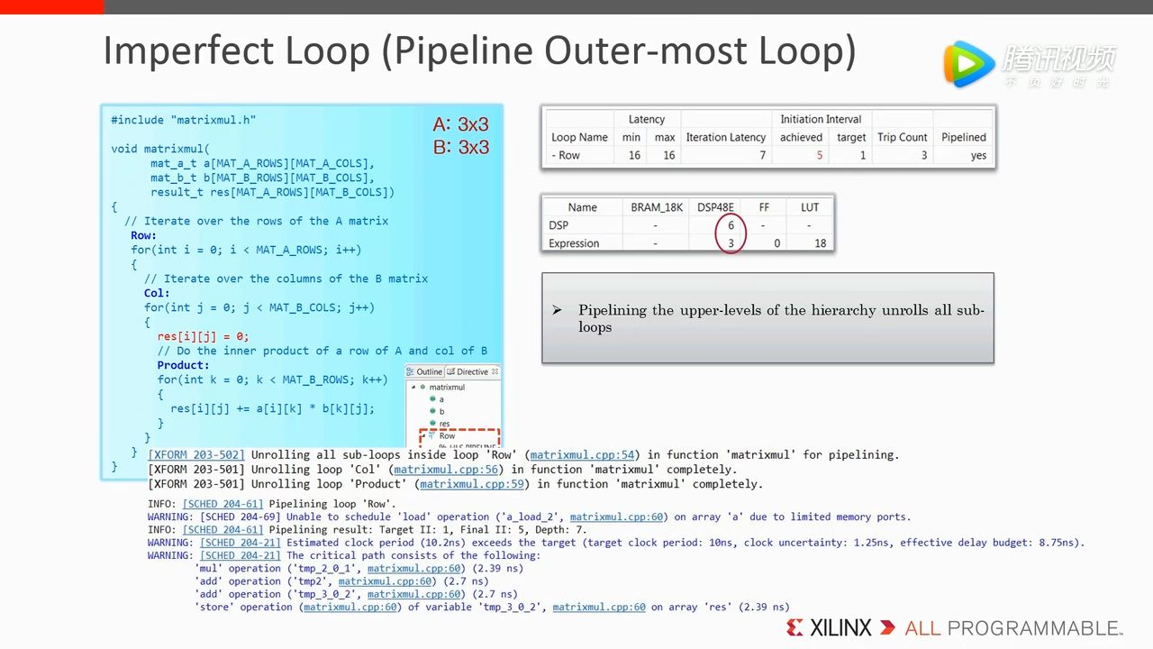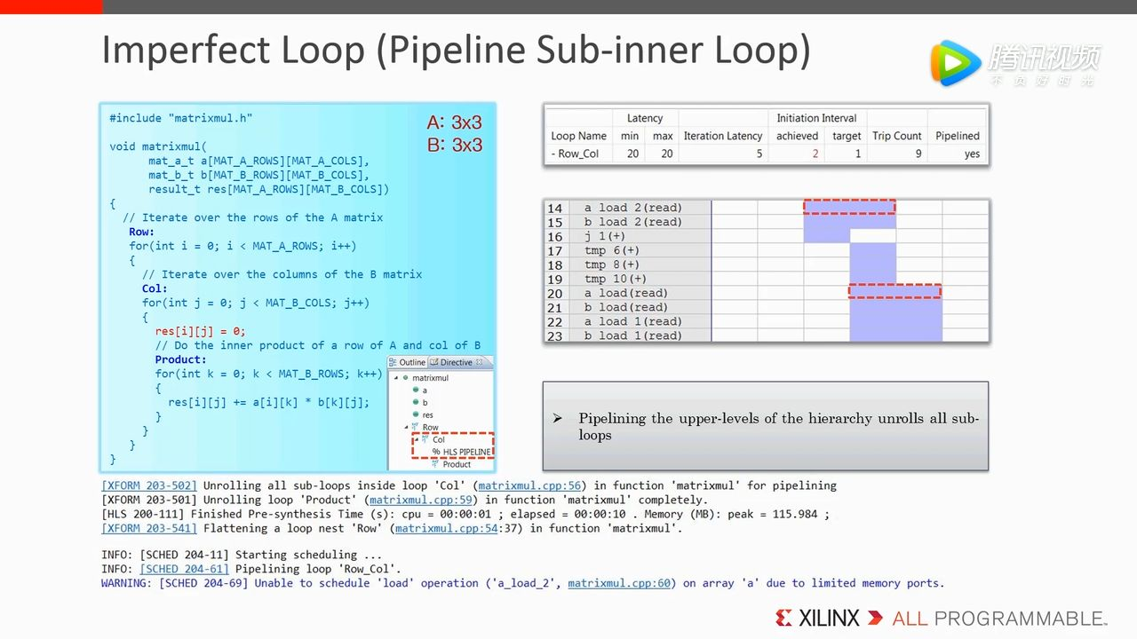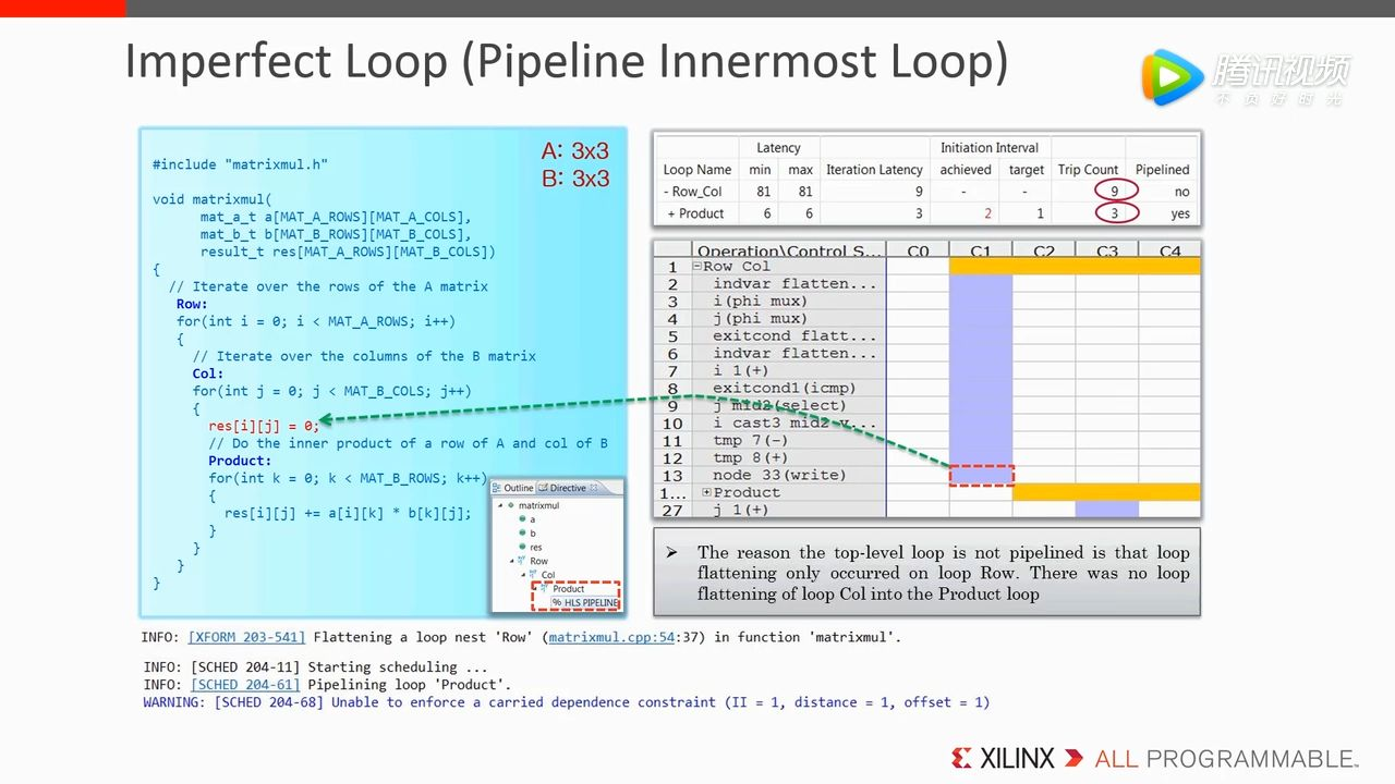 因为最内层 for 循环外面有循环体,所以这里不能使用上面的 LOOP_FLATTEN。因此可以看到这里的 Trip Count 是 9,然后 product 是 3 即执行最内部的 for 循环。