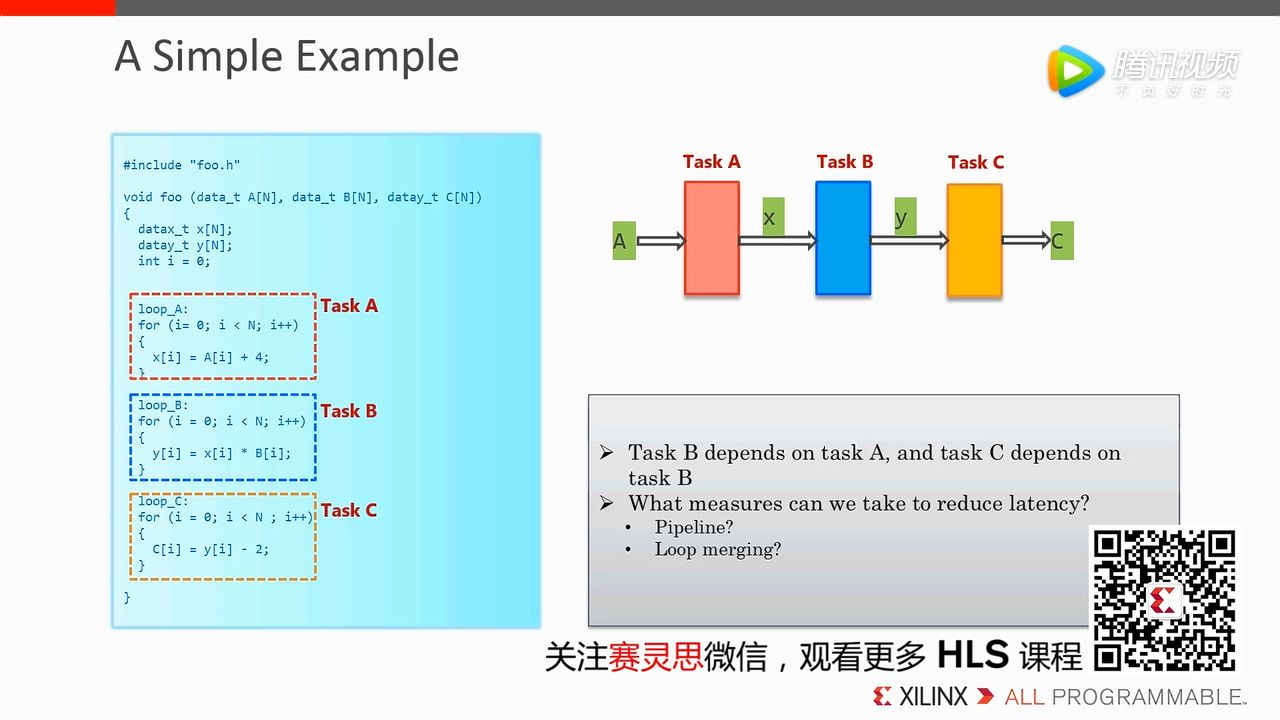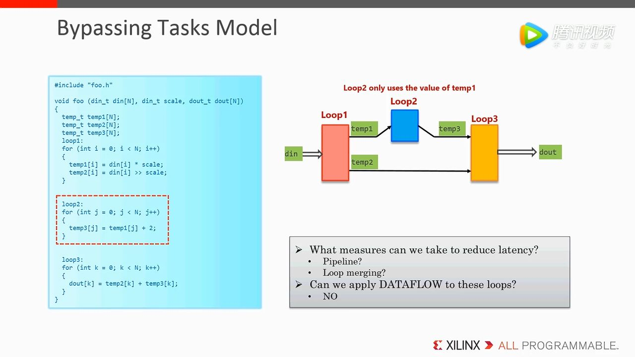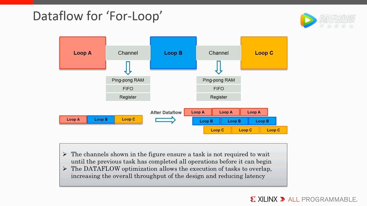 引出 Dataflow 这种优化方式,两两模块之间插入了 Channel,这种方式可以确保当前 Task 执行不需要等待上一个 Task 执行结束,并且允许 task 执行存在 overlap,这种 overlap 可以帮助我们降低 latency,从而提高吞吐率。在这个例子中,Loop B 不需要等待 Loop A 循环完全结束,只有它有输出就可以使用当前的输出去执行 Loop B。